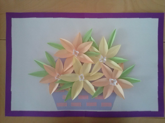 В нашем саду все группы, соответственного возраста, работают по еженедельной тематике. Одна из таких недель у нас прошла по темой: "Весна". Всю неделю мы с детьми говорили о весне, играли в настольные и подвижные игры отражающие данную тематику, лепили воробьев, а вот на аппликации мы делали "Красивые цветы". Предлагаю вашему вниманию, может наша идея кому-то понравится и пригодится. Один цветок сделан для образца, остальные лепестки дети вырезали сами по отчерченному контуру; где-то я им помогала. Приклеивали сами, а листики вырезала сама специальными ножницами, дети пробовали, но не смогли, сложно еще. А догадайтесь, что-за цветы?