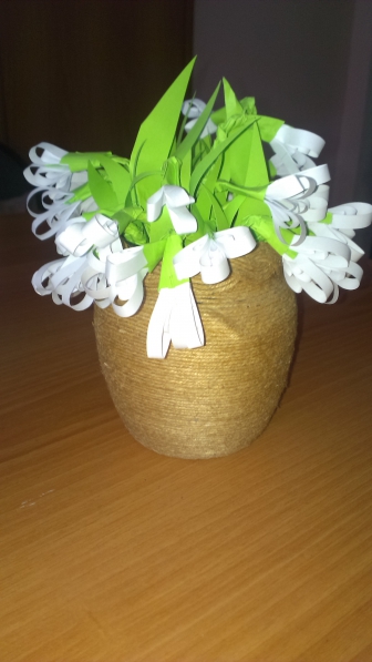 1. Сминаем и скручиваем по часовой стрелке длинную широкую полоску зеленого цвета. Это стебель подснежника.