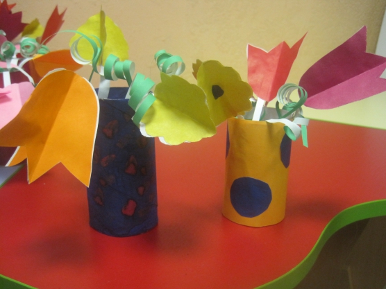 С опозданием хочу предоставить на ваш суд детские работы. Ваза для мамы. В нашей поделке мы использовали трубочки от туалетной бумаги, краску, цветную бумагу, клей. Трубочки можно обклеить цветной бумагой а можно разукрасить красками.