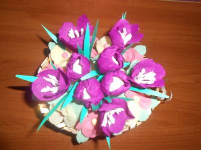 Каждый любит свою маму и хотел бы сделать ей подарок. вот и мы приготовили подарок маме. Для этой поделки нам понадобиться: гофрированная бумага фиолетового цвета, цветная бумага зеленого цвета, салфетки белого, желтого, розового и зеленого цвета, ватные палочки, нитки, ножницы, клей, кисточка для клея. Из гофрированной бумаги делаем цветки крокуса. Из зеленой бумаги стебель и лепестки. Из салфеток - цветки примулы. Всю композицию красиво оформляем в плетенную корзиночку. Вот такой букет!