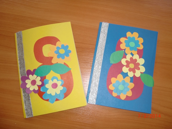 Теперь наступает самая интересная часть работы, когда надо творить. Детям были даны три больших цветочка, три поменьше, серединки цветочков и листочки. Надо было разместить большие цветы на восьмёрке, потом их приклеить, затем приклеить цветочки поменьше и серединки. Дальше завершить работу, добавить листочки.