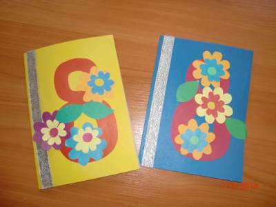 Берём лист картона и складываем его пополам. Затем приклеиваем вертикально с краю тесьму. Далее посередине открытки клеим восьмёрку.