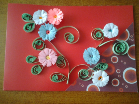 А самый главный подарок сделан своими руками - поздравительная открытка. В этом году ее мы изготовили в технике квиллинг.