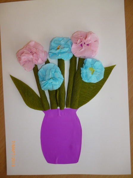 Приклеиваем к стебелькам- наша вазочка с цветами готова.
