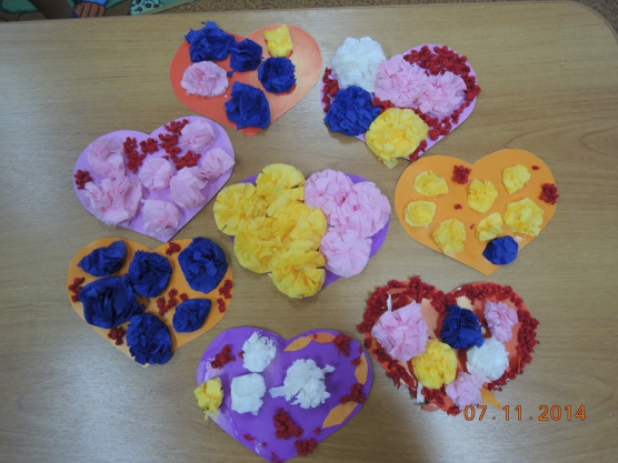 Результат, нашей работы, яркие, пушистые, объёмные сердечки для наших мамочек.