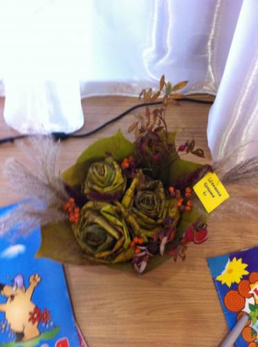 позволяют букеты и композиции из осенних цветов. В конце сентября у нас прошел "Осенний вернисаж". Вот такие замечательные поделки сделали дети. Для этого букета Каролина несколько дней собирала листья, это способствует развитию вкуса у ребенка. В осенний букетах часто можно увидеть не только цветы и травы, но и ягоды. Собирая из листьев розочки, развивается мелкая моторика рук, которая способствует развитию речи у ребенка.