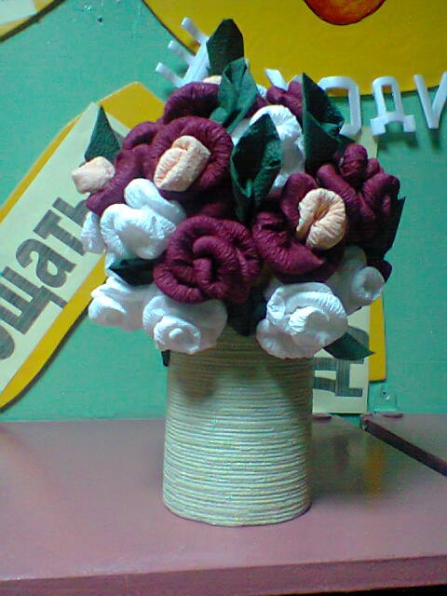 Крепим его к вазе. С помощью горячего пистолета начинаем украшать наш шар готовыми розочками. Для контраста мы из четвертушек зеленых салфеток сделали листочки. И вот что у нас получилось.