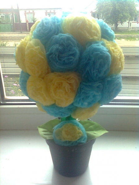 Для поделки понадобиться цветочный горшочек, газета-основа для цветов, трубочка бумажная для ножки, салфетки для изготовления цветов, степлер, потолочный клей. Сначала изготовим основу для шара (можно сделать как папье-маше, а можно газете придать форму шара и обклеить желтой салфеткой. Затем вставить ножку и закрепить в цветочном горшке. Теперь готовим цветы.