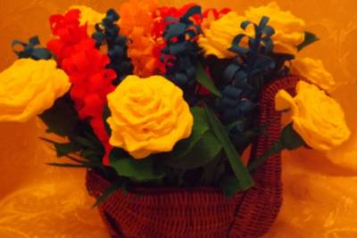 нам потребовалась гофрированная бумага разных цветов, стебли- китайские палочки. Уже готовые цветы были оформлены в плетенную из ивовых веточек уточку.