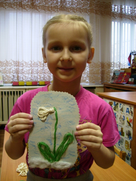 Наконец-то наступила весна, а подснежник - это первый её подарок. Что может быть прекраснее, чем символ возрождения природы после холодной и снежной зимы. Мы с ребятами моей группы читали про это растение, рассматривали живые цветы, которые выросли на клумбе во дворе, слушали прекрасную музыку П. И. Чайковского, конечно же, рисовали подснежник. А потом я предложила сделать его из ниток. Эта работа хорошо развивает мелкую моторику, учит детей нетрадиционным приемам работы с нитками. Посмотрите, это не сложно, но может быть вам понравится и пригодится в работе.