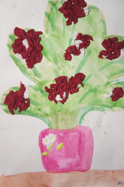 Сначала мы с ребятами нарисовали основу, серую вазу и большие зеленые листья. На листьях простым карандашом отметили расположение будущих цветов. Теперь веселое задание – порвать белую салфетку на небольшие кусочки. Можно мусорить и никто ничего не скажет, а только похвалит. Затем из этих кусочков можно скатать небольшие шарики. Размещая по несколько шариков рядом, можно сформировать соцветия цветка. Далее мы с ребятами приклеили шарики к основе. (краски на рисунке должны хорошо просохнуть). Теперь берем салфетку любого другого цвета, предварительно прикинув, где именно «распустятся» бордовые или синие цветы, порвать, скомкать и начинать приклеивать. Ребятам объяснила, что нужно хорошенько прижимать будущие цветы к листьям. Посмотрите что у нас получилось с ребятами средней группы. Мы поздравили своих любимых мамочек с 8 марта. А как приятно принять такой подарок маме от своего малыша, не только в весенний праздник, в любой другой день!
