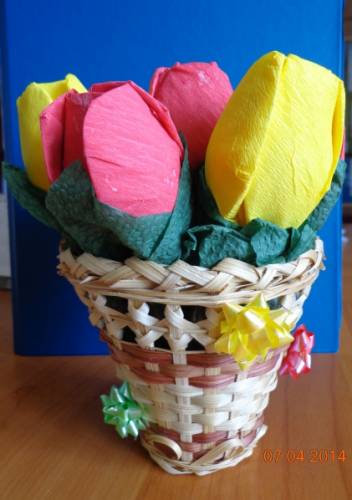 Замечательный весенний букет сделан детскими руками из. обыкновенных пластиковых ложечек и оформлен в разноцветную гофрированную бумагу. А как красиво цветочный букет смотрится в плетеной корзиночке.