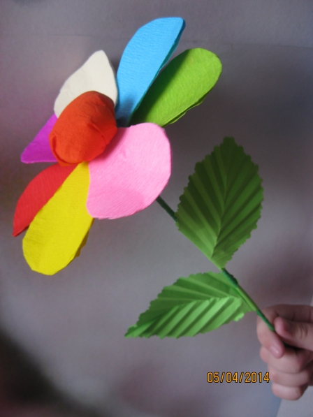 Стебелёк обматываем зелёной креповой бумагой, и потом приклеиваем к нему листочки.